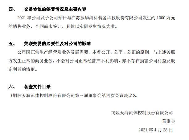 2021-013-天海流體-半于新增2021年預計日常性關聯交易的公告
